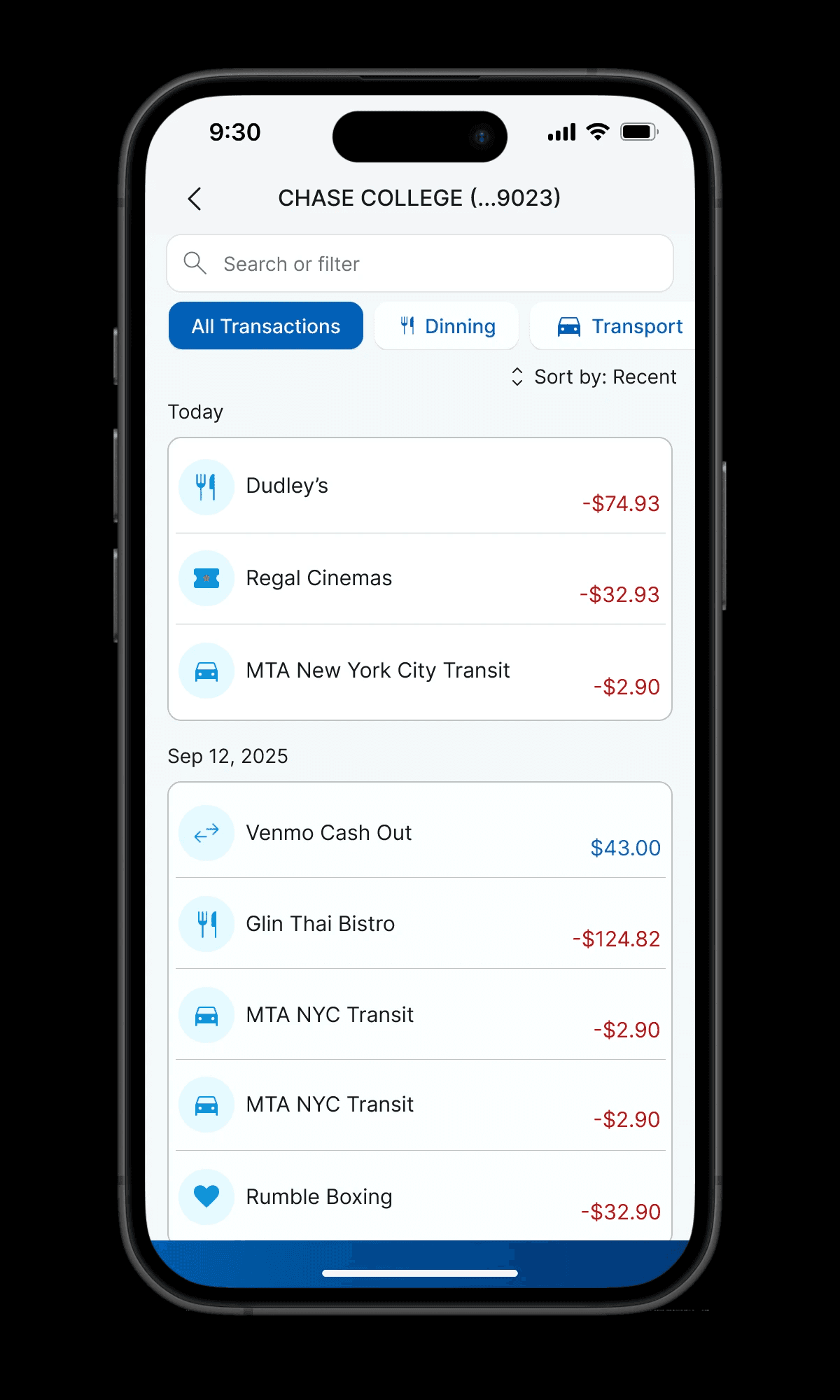 Adding icons to transactions helps users visually understand the type of transaction at a glance. This redesign creates a cleaner, less cluttered view while enabling easy filtering by category.